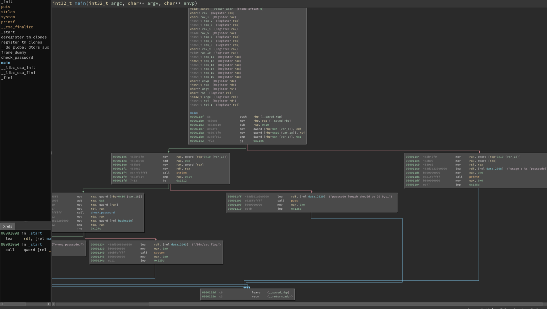 There doesn’t appear to be any obvious hardcoded check in check_password(). However, back in main() at 0x1125 we see that a return value from check_password() in moved into rdx and a symbol called hashcode is moved into rda. At 0x122f a comparison is made between rda and rdx which results in our cat flag.
