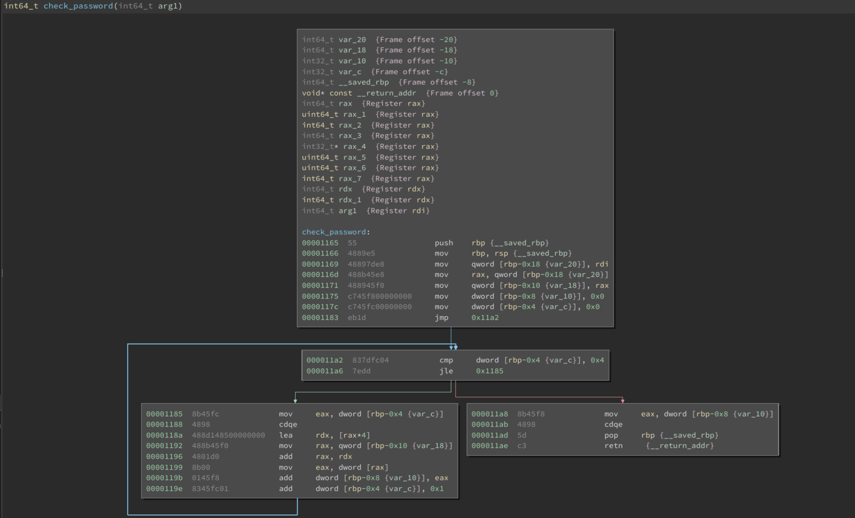 We can see the first branch from 0x11be checks to see if an argument has been passed. 0x11f9 then checks if the argument is 20 bytes long. The third block calls the function check_password(), compares the result and issues a system call to run ‘/bin/cat flag’