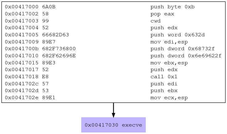 So let’s generate the payload using msfpayload and specify ‘/sbin/ifconfig’ as the executable the shellcode should spawn. The output format of msfpayload will be ‘R’, raw, which will be fed into (-S stdin) sctest and an image file name (-G libemu-exec.dot) is specified for a flow diagram of the execution pattern.